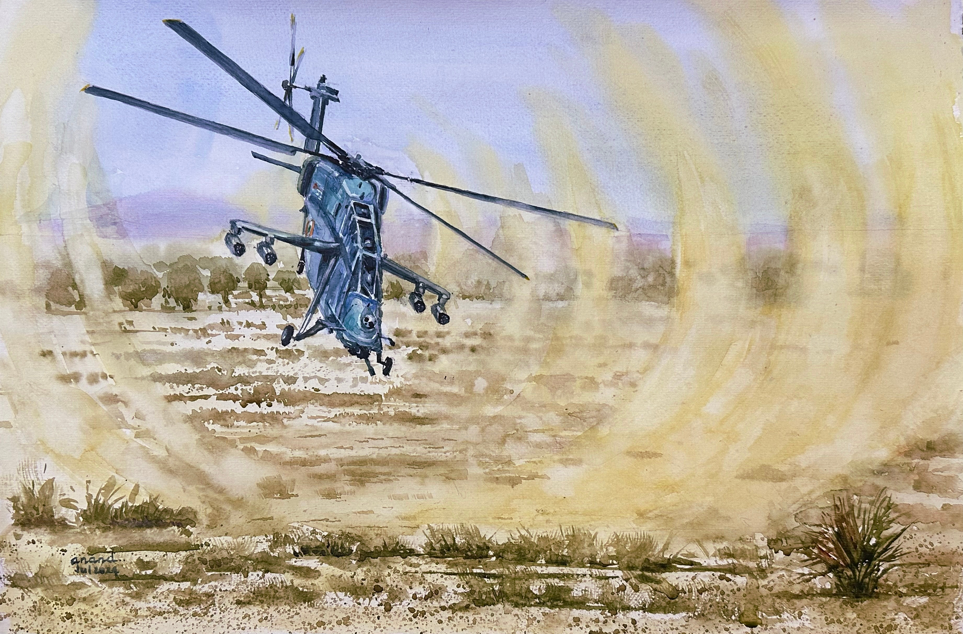 Nap-Of-the-Earth, is one of the most challenging flights that helicopters do to hug the terrain and fly to avoid detection. Here is a challenging painting for watercolours of the Prachand (Light Utility Helicopter of HAL) during a demonstration flight in deserts of western India. Referenced from a photograph clicked by @SanjaySimha. Watercolours on 300gsm Canson 18 x 12 inch, reference photograph by #sanjaysimha #prachandhelicopter #noe #watercolorartist #watercoloraircraft #artistsoninstagram #aquarela #artbymranand #artbymra #hindustanaeronauticslimited #indianairforce #lightcombathelicopter #lch